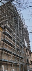 Oggi è iniziata la fase di installazione delle strutture di carpenteria metallica a supporto delle cinque campane restaurate e di consolidamento interno della cupola ogivale della chiesa Collegiata a Santarcangelo di Romagna. Le attività sono condotte con estrema cautela e con le attenzioni necessarie, grazie all’impiego di attrezzature adeguate e con maestranze dotate di grande esperienza e provata affidabilità. Contemporaneamente sono in fase di smontaggio due ordini del ponteggio dei quattro in opera al margine del transetto sx della chiesa.